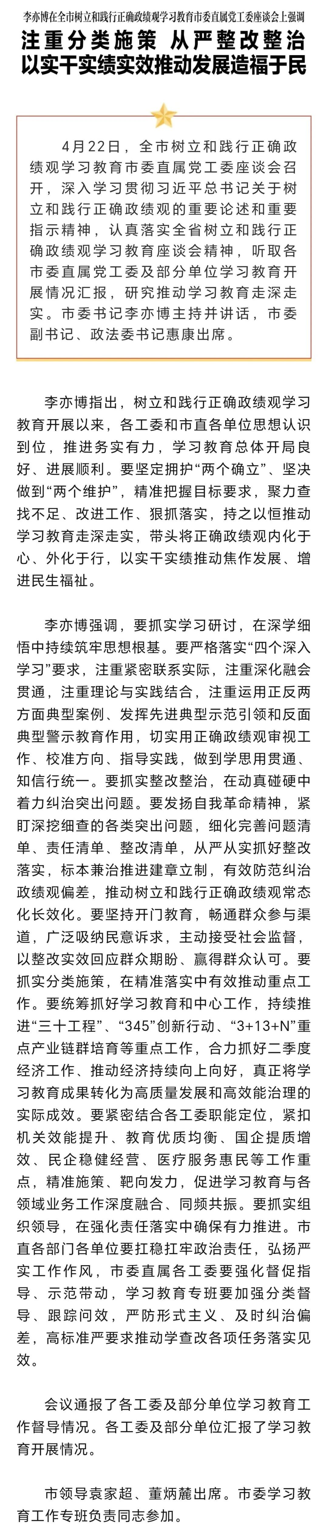 李亦博在全市树立和践行正确政绩观学习教育市委直属党工委座谈会上强调 注重分类施策 从严整改整治 以实干实绩实效推动发展造福于民